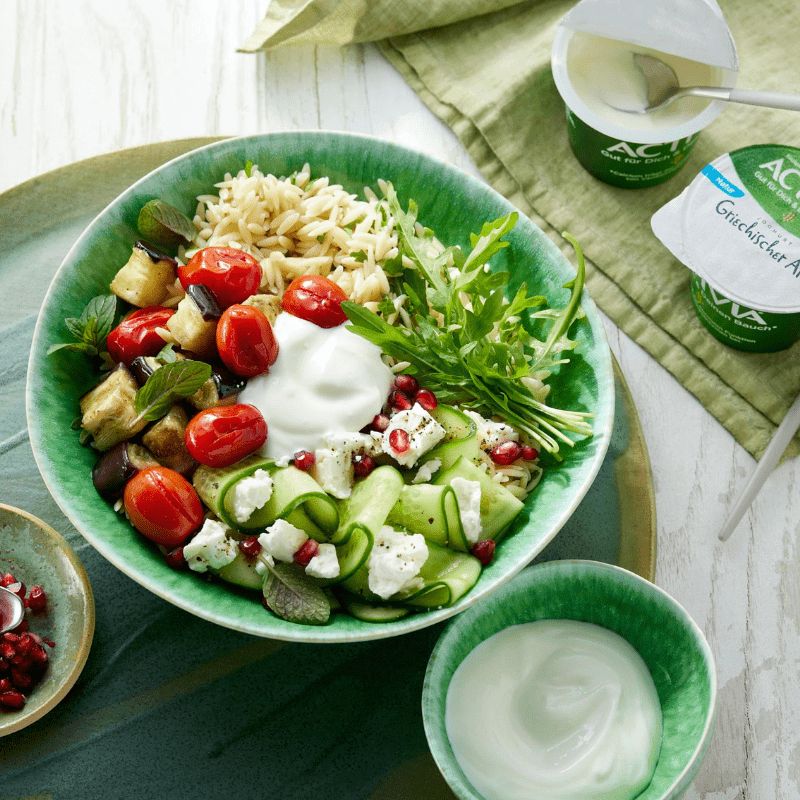 Laver les herbes et la roquette, les secouer pour les sécher et couper les herbes en petits morceaux. Mélanger les herbes et la roquette avec les nouilles de riz et assaisonner. Répartir dans 4 bols. Laisser refroidir un peu les aubergines et les tomates et les disposer sur les nouilles de riz avec les concombres. Arroser d'ACTIVIA Classique, garnir de menthe et de graines de grenade et, selon les goûts, d'un peu plus de roquette.